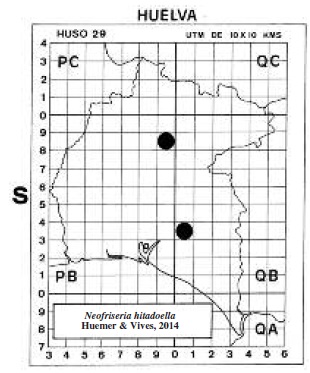 Neofriseria hitadoella Karsholt & Vives, 2014 (KARSHOLT & VIVES MORENO, 2014), que ha sido descrita de imagos capturados en Huelva, Granada, Málaga y Zaragoza en España y del norte y centro de Portugal, por lo que debe estar más extendida por la Península Ibérica. Los de Huelva fueron obtenidos ex larvas sobre Rumex acetosa L. y Rumexcrispus L.