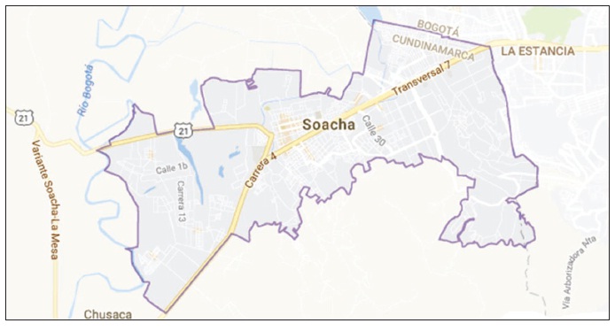 El estudio se realizó en el municipio de Soacha, Cundinamarca, el cual posee una extensión de 184 km2 y una población estimada de 522.442 de habitantes. El municipio de Soacha presenta una ascendencia muisca (Suacha) que en español significa ‘Ciudad del Dios Varón’, como herencia del pueblo indígena que hasta los años 1600, posterior a la colonización, habitó dicho territorio (ALCALDÍA-SOACHA, 2016).