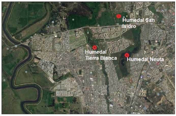 Para el presente estudio se tomaron en cuenta los humedales Neuta, San Isidro y Tierras Blanca por el permiso de ingreso y colecta por parte de la autoridad correspondiente (Fig. 2).
