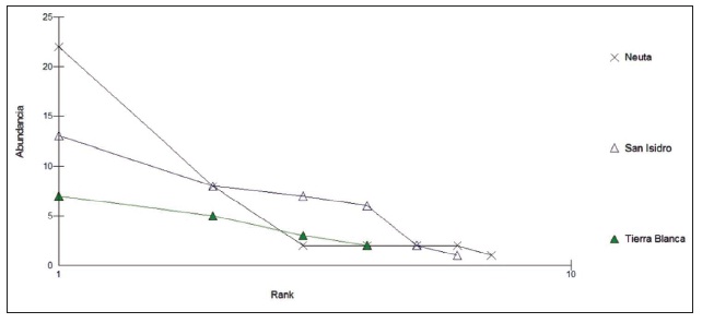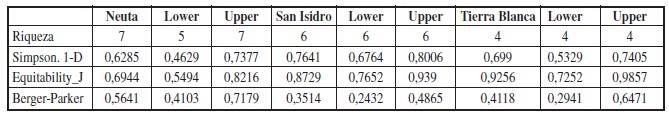 Se evidencia así mismo que el Humedal San Isidro presenta el valor más alto de diversidad (0,7641), seguido del Humedal Tierra Blanca (0,699) y por último el Humedal Neuta (0,6285) (Tabla II), aunque no se presentaron diferencias significativas (Kruskal-Wallis p-value: 0.4212). El resultado obtenido para el estimativo de diversidad se corroboró con el resultado encontrado para el estimativo de dominancia, puesto que el humedal de San Isidro presentó el menor valor de dominancia, seguido de Tierra Blanca y Neuta con el mayor valor de dominancia, corroborando que a mayor valor de diversidad menor dominancia (MAHECHA-JIMÉNEZet al., 2011; URBANO et al., 2014).