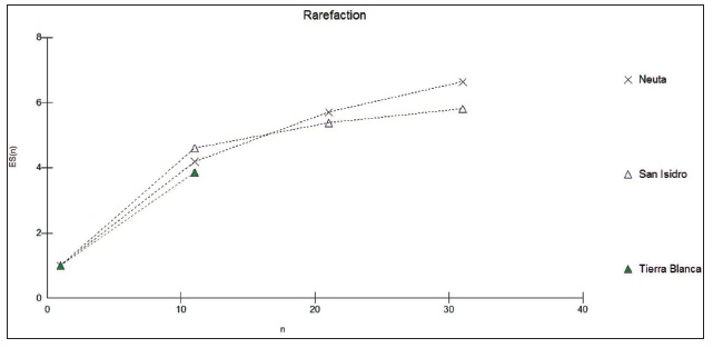 Al observar la curva de rarefacción (Fig. 4), se evidencia que aún puede haber una mayor riqueza esperada en cada humedal al aumentar el esfuerzo de muestreo. Sin embargo, se evidencia que para el humedal Neuta y San Isidro hubo un buen esfuerzo de muestreo ya que la curva tiende a una asíntota, lo que no ocurre en el humedal de Tierra Blanca, en donde según la prueba hay una alta probabilidad de registrar una especie diferente, aunque en términos de perturbación antrópica es el humedal que más intervención presenta, lo que haría imposible que aparezca un nuevo registro de especies en la zona.