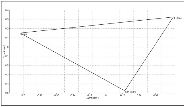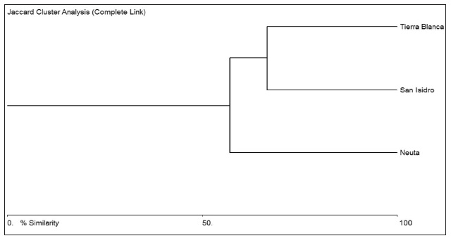 En cuanto al recambio de especies entre los humedales muestreados se evidencia una similitud entre el humedal San Isidro y Tierra Blanca (0.67), debido a que su relación entre la composición y abundancia son similares, aunque a su vez, existe una similitud entre el humedal San Isidro y Tierra Blanca con el humedal Neuta (0.63) (Fig. 5), permitiendo inferir que no hay una diferencia en el recambio de especies entre las áreas de estudio, lo cual es reafirmado por la prueba de Kruskal-Wallis (p-value=0.053). El anterior resultado es corroborado por la prueba NMDS (Stress de Kruskal=0.00) (Fig. 6).