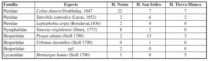 Se colectaron 93 individuos distribuidas en 4 familias, 8 géneros y 8 especies para los tres humedales. En donde la familia Pieridae y Hesperiidae fueron las más representativas para los tres humedales. Sin embargo, un individuo perteneciente a la familia Hesperiidae no pudo ser determinado por su estado de deterioro en el momento de la colecta, pero se incluyó en el análisis (Tabla I). Lo anterior permite evidenciar baja riqueza de las especies en los diferentes humedales de estudio y la dominancia de algunas sinantrópicas como Colias dimera Doubleday, 1847 y Vanessa virginiensis (Drury, 1773).