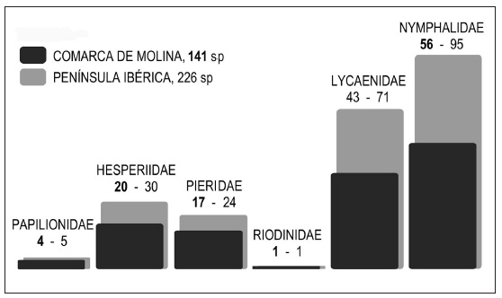 Para estimar la diversidad de la Comarca de Molina, con 141 especies de Papilionoidea, deberíamos compararla con otras áreas peninsulares, para ello y aunque sea aleatoriamente citamos algunas cifras para que nos sirvan de referencia. PÉREZ-FERNÁNDEZ (2005, 2007) indica 137 especies en la cercana Serranía de Cuenca y para la provincia de Guadalajara da un total de 146 especies y en algunas zonas como el Alto Tajo 135, en la Preserranía de Cogolludo 104, en el Macizo de Ayllón 128 y para la Alcarria 118. En GARCÍA-BARROS (2004) la provincia de Teruel presenta 151 especies. GARRIDO (2006) fija en 163 las especies conocidas en la provincia de León. OCHARAN (2007) recoge 65 especies para la Reserva de la Biosfera de Muniellos y 150 en Asturias. DE ARCE (2013) ofrece cifras actualizadas de 148 especies para la provincia de Cuenca. VICENTE-ARRANZ et al. (2013) 137 taxones para la provincia de Ávila. GARCÍA-CARRILLO et al. (2014) estima 101 especies en el catálogo de Rhopalocera de la provincia de Toledo. VICENTE-ARRANZ et al. (2014) 164 especies para la provincia de Palencia. GARCÍA-CARRILLO et al. (2010) ofrece datos actualizados de 147 especies censadas en la provincia de Madrid.