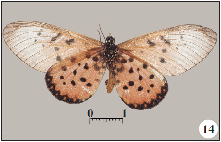 The FW length is 25-30 mm, with that of the female often being slightly larger. The species, known from the Afrotropical Region, S Arabia included, is somewhat variable which led to the description of several suspecies, presently considered as lacking validity. It is, however, quite distinctive and impossible to mistake with any other Acraea from STPR due to the apically vitreous FW with some inconspicuous marginal intervein orange markings and to the existence of marginal lunules on the HW (Figs. 12-16). The FW base and the whole HW ground-colour is deep orange in the males and lighter orange-ochre or greyish in the females. There are several black dots on the FWD, and on both the HW surfaces, which are variably developed but usually larger in the females; one of them is a cell-spot, another exists at the cell apex. The HWD has a wide black margin usually containing orange round dots, almost indistinct in the darker specimens. In the basal HWV there are 2-3 black and white contrasting spots, distinct, however, from the “chequered” basal area of the larger A. (Acraea) zetes annobona D’Abrera, 1980, a common and widely distributed species known all along ST and PR.
