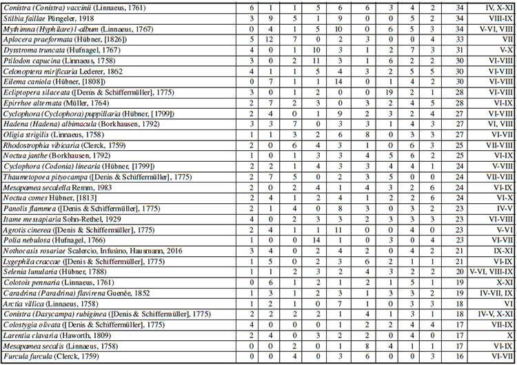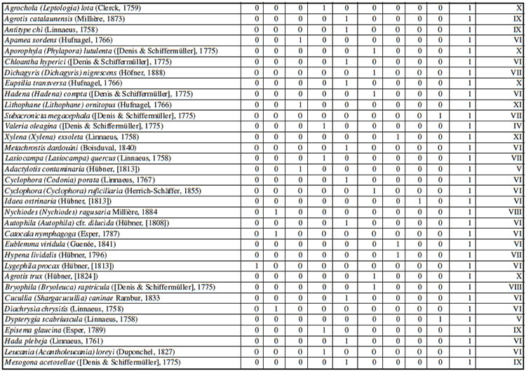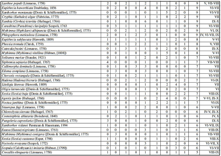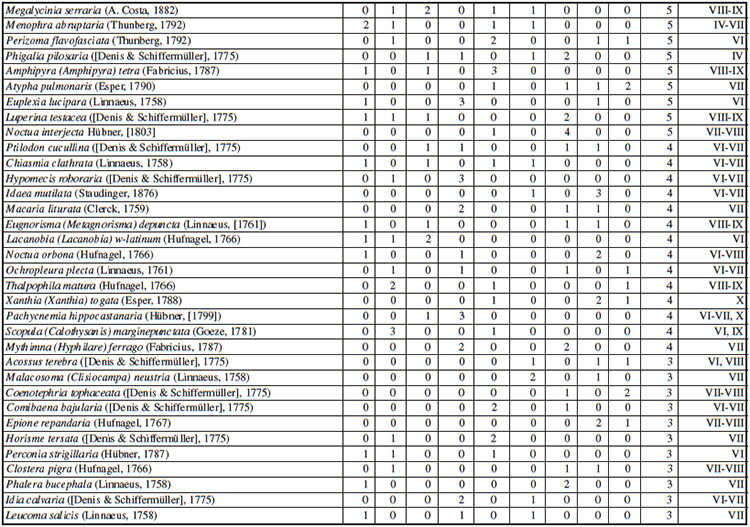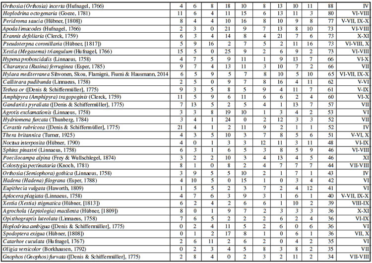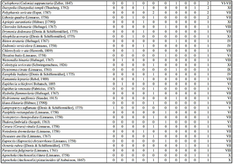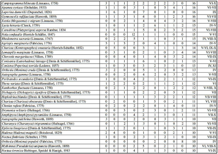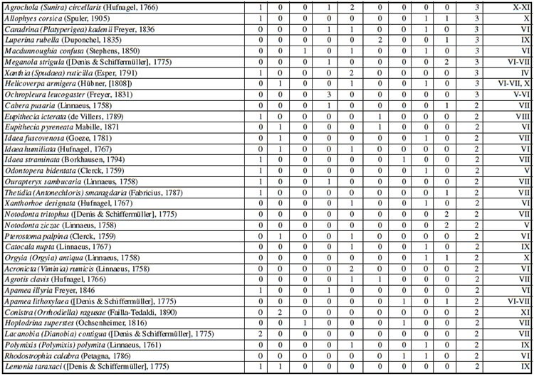We recognized 34 ubiquist species composing the 10.9% of the total abundance. Most abundant were Peribatodes rhomboidaria (n=360), Noctua pronuba (n=214) and Idaea degeneraria (n=141), accompanied by several species belonging to the genera Agrotis, Noctua, Mythimna, Idaea and Scopula.