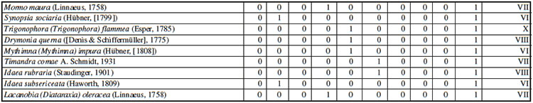 Among species found with few individuals a large ecologically homogeneous group is composed by Cyclophora ruficiliaria, C. porata, C. suppunctaria, Adactylotis contaminaria, Catocala nymphagoga, and Lasiocampa quercus feeding mainly on Quercus that likely are sporadically present in the surroundings of sampled sites. With clear affinity to warmer places are Xanthia ruticilla, Rodostrophia calabra, Hypena lividalis, Agrotis trux, Synopsia sociaria, and Trigonophora flammea, the last of which has been found in more sites and with more individuals in pure pine forests (SCALERCIO & GRECO, 2018).