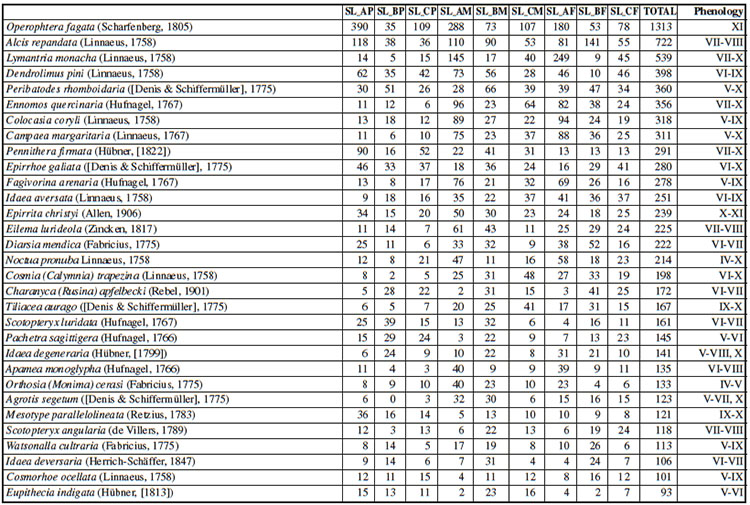 Eight species (n=2,237), representing the 18.7% of the whole community, are strictly linked to the dominant tree species, but with those linked to beeches (Opeophtera fagata, Ennomos quercinaria, Watsonalla cultraria, Cyclophora linearia) more abundant (n=1806) than those feeding on pines (n=431), namely, listed according to their abundance, Pennithera firmata, Eupithecia indigata, Thaumetopoea pityocampa, and Panolis flammea. This can be due to the climatic and edaphic conditions of the study area which tend to be more favorable to the beech than to the pine as demonstrated by the presence of beech renewal also in pine-dominated sites that probably will tend to naturally evolve towards a beech forest (NICOLACI et al., 2014), explaining also the absence of pine feeding moths among the top four species.