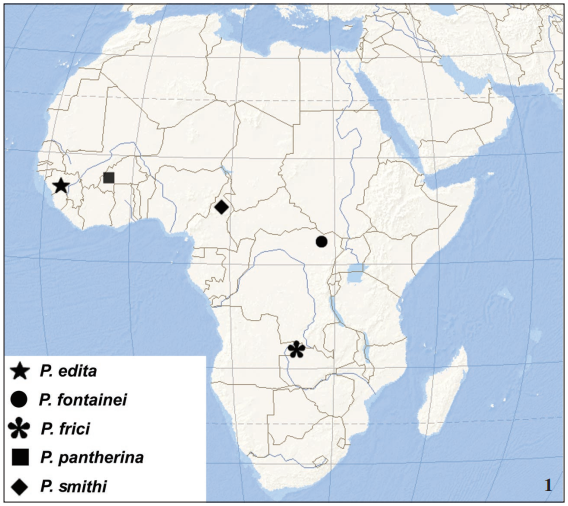 The genus Politzariella Yakovlev, 2011 includes four species: P. pantherina Yakovlev, 2011 (type locality - Ober Volta [Burkina Faso], Bobo Dioulasso), P. fontainei Yakovlev & Witt, 2016 (type locality - [Congo] Uele, Paulis [Isiro], [2º46’00” N/ 27º37’00” E]), P. edita Yakovlev, Müller, Kravchenko & Petrányi, 2019 (type locality - Guinea Konakri, Macenta Prefecture, Ziama Forest, Mt. Nimba), and P. frici Yakovlev & Sáfián, 2019 (type locality - Zambia, Mwinilunga district, North- Western Province, Chiwoma riverine forest). All species of the genus are known only from their type localities (Fig. 1).