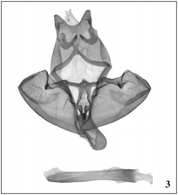 Male genitalia: Uncus bifid, heavily sclerotized very broad at base, with two short, apically broadly rounded triangular arms; medial incision of uncus wide, semicircular. Gnathos reduced, its arms short and robust, strongly curved, with tapered sclerotized apices, rather hook-shaped, medially unfused; tegumen robust, trapezoidal; valva short, rectangular, apically truncate, costal margin with a small, but well expressed, triangular digitus erected medially projecting towards the medial plate of valva; sclerotized harpe on costal edge (in middle third), distal margin conspicuously straight, ventral margin slightly rounded, sacculus narrow, without processes; juxta heavily sclerotized, rather elongated, very characteristic in shape (see Fig. 3); saccus narrow, medium long, apically semicircular; phallus tubular, straight, narrow, its length as that of valva, vesica aperture in dorso-apical position, vesica without cornuti.