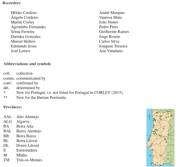 13 species new for Portugal are listed below, of which three are new for the Iberian Peninsula. Three species are removed from the Portuguese list. A few of the new species listed here have been previously listed for Portugal, but the records were rejected in CORLEY (2015), as being erroneous or unsubstantiated.