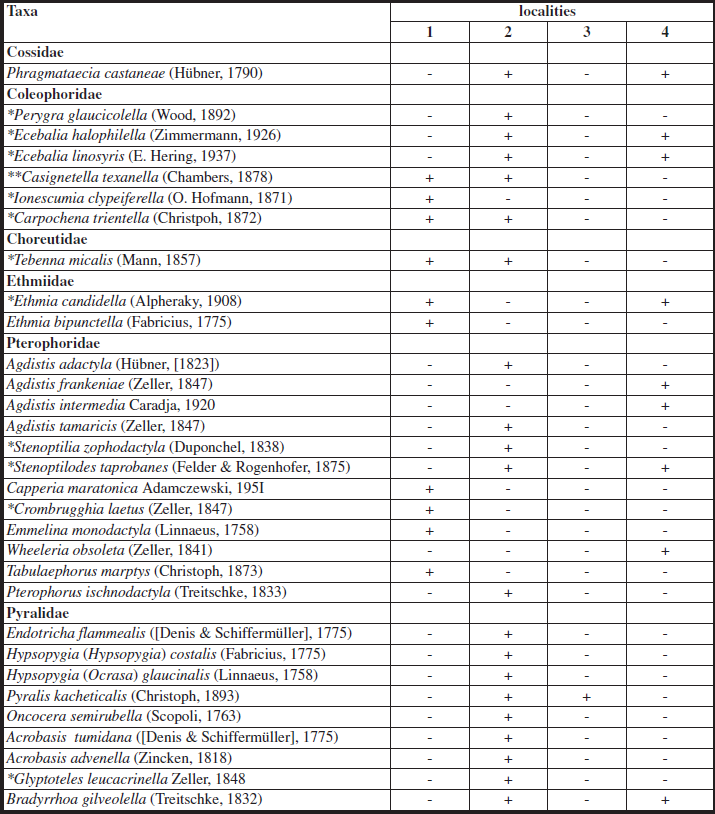 Abstract: The article provides the list of Lepidoptera (the families: Cossidae, Coleophoridae, Choreutidae, Ethmiidae, Pterophoridae, Pyralidae, Crambidae, Lemoniidae, Lasiocampidae, Drepanidae, Geometridae, Sphingidae, Erebidae, Noctuidae, Lycaenidae, Nymphalidae, Pieridae), collected in four localities in the Republic of Dagestan in September 2020. In total, 207 species have been recorded. Five species are reported for the fauna of Russia for the first time: Casignetella texanella (Chambers, 1878) (Coleophoridae), Agriphila cyrenaicellus (Ragonot, 1887), Thyridiphora furia (Swinhoe, 1884), Haritalodes derogata (Fabricius, 1775) (Crambidae), and Scopula minorata (Boisduval, 1833) (Geometridae); 23 species - for the fauna of Eastern Caucasus: Perygra glaucicolella (Wood, 1892), Ecebalia halophilella (Zimmermann, 1926), E. linosyris (E. Hering, 1937), Ionescumia clypeiferella (O. Hofmann, 1871), Carpochena trientella (Christpoh, 1872) (Coleophoridae), Tebenna micalis (Mann, 1857) (Choreutidae), Ethmia candidella (Alpheraky, 1908) (Ethmiidae), Stenoptilia zophodactyla (Duponchel, 1838), Stenoptilodes taprobanes (Felder & Rogenhofer, 1875), Crombrugghia laetus (Zeller, 1847) (Pterophoridae), Glyptoteles leucacrinella Zeller, 1848, Cadra calidella (Guenée, 1845), (Pyralidae), Agriphila selasella (Hübner, 1813), Agriphila tolli (Bleszynski, 1952), Agriphila poliellus (Treitschke, 1832), Pediasia contaminella (Hübner, 1796), Pediasia fascelinella (Hübner, [1813]), Uresiphita gilvata (Fabricius, 1794), Antigastra catalaunalis (Duponchel, 1833) (Crambidae), Watsonalla binaria (Hufnagel, 1767) (Drepanidae), Idaea degeneraria erschoffi (Christoph, 1872), Scopula nigropunctata (Hufnagel, 1767), and Rhodometra sacraria (Linnaeus, 1767) (Geometridae).