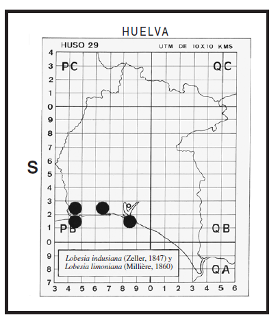 Ciclo biológico y distribución: Lobesia indusiana, ha sido descrita del sur de Francia como Lobesia staticeanaMillière, 1868, describiendo la oruga y su planta nutricia, Limonium cordatum (L.) Mill. Citada como Polychrosis staticeana, del sur de Francia y Sicilia, la larva sobre Limonium sinuatum (L.) Mill. de abril a mayo y los adultos en junio-julio y septiembre-octubre, y como Polychrosis indusiana, de Sicilia (KENNEL, 1916). También como P. staticeana en Biskra (Argelia), la oruga en abril sobre Limonium tournefortii (Boiss.) Erben y el imago en mayo (CHRÉTIEN, 1917). Descrita de Ucrania como Polychrosis cognata (OBRAZTSOV, 1949). Citada de España como L. cognata y L. indusiana (OBRAZTSOV, 1953). La oruga de P. staticeana, ha sido descrita someramente, encontrándose en las flores de Statice limonium desde agosto hasta mayo en el sur de Francia (SWATSCHEK, 1958). Vuela en agosto en Marruecos (RUNGS, [1980]). Citada de España por VIVES MORENO (1992, 1994 y 2014). Se extiende por la zona mediterránea de Francia, España, Cerdeña, Sicilia, Italia y Yugoeslavia (KARSHOLT & RAZOWSKI, 1996). Ha sido citada de final de agosto de Rumania, y sus orugas en Limonium gmelinii (Willd.) Kuntze (KOVÁCS & KOVÁCS, 2001). También de Macedonia, Bulgaria, Crimea y Daghestan (Caucasus); la larva en los tallos de Limonium meyeri (Boiss.) Kuntze, y adultos en mayo y junio (RAZOWSKI, 2003). Citada de Meia Praia (Algarve) Portugal, 4 octubre 1999 (CORLEY, 2005). De las salinas de Santa Pola (Alicante) (HUEMER & WIESER, 2010). En el litoral de Huelva, “Marismas de Isla Cristina” UTM 29SPB41 y 42, “Marismas del Río Piedras y Flecha del Rompido” UTM 29SPB62, “Marismas del Odiel” y “Estero de Domingo Rubio” UTM 29SPB81 (ver mapa), han sido localizadas las orugas en un tubo de seda sobre las ramas y flores de Limonium ferulaceum (L.) Chaz. (fig. 17), en mayo y junio, hacen los capullos protegidos por excrementos y restos de flores, saliendo los adultos a final de junio.