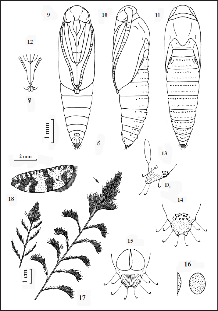 Lobesia indusiana (Zeller, 1847): El huevo (fig. 16) es elíptico, aplastado, de 0,75 x 0,55 mm, corion poco rugoso, verde claro, luego amarillento y después rosáceo. La oruga en su último estadio (figs 1 y 2) mide 11 mm de longitud, pardo amarillento. Los pináculos anchos, portando setas rubias (fig. 3). Patas torácicas amarillentas, los tarsos más oscuros. Las patas abdominales del color del cuerpo, las ventrales coronadas con ganchos amarillos. Los espiráculos redondeados o en forma de elipse, amarillos con el peritrema castaño. La cápsula cefálica (fig. 4) mide de 0.80 a 0.90 mm de ancha, castaño claro; los ocelos y la mancha postocelar alargada, oscuras. En las antenas, la antacoria translúcida con la zona inferior amarillenta; el artejo basal translúcido; el artejo medio amarillo con la zona baja translúcida y el artejo terminal amarillo claro. Escudo protorácico (fig. 5) pardo claro con el borde posterior más oscuro; en algunos ejemplares todo pardo oscuro; está dividido en dos por una línea fina muy clara. Tabula alargada pardo amarillenta (fig. 8). El escudo anal (en la fig. 6 con el 9º urito) cuadrangular, pardo amarillento. El expulsor de excrementos (fig. 7) está situado debajo de la placa anal y cuya función se explica en HUERTAS-DIONISIO (1987), tiene de 5 a 6 espinas amarillentas insertadas en una gran base carnosa subcuadrangular. La crisálida macho (figs 9, 10 y 11) mide de 5 a 6 mm de longitud, de color pardo; cabeza redondeada, grande en relación con el cuerpo, con formación de un cuello en la zona del protórax; final de las antenas envolviendo el extremo de las patas mesotorácicas. La hembra es mayor, mide 6,50 mm y tiene las antenas más cortas (fig. 12). En el dorso de los uritos 2 a 8 tiene doble hilera de espinas, las anteriores de mayor tamaño (a veces, algunos ejemplares, no tienen la segunda hilera en el 8º urito); en el noveno solo tiene una hilera y en el décimo un pequeño grupo de espinas que tocan a la seta ganchuda D1 (fig. 13). Cremaster poco rugoso, castaño, borde irregular, con quiebros formados por líneas curvas; tiene ocho setas ganchudas, correspondientes a las D1, D2, SD1 y SD2 del escudo anal (fig. 14) y con estrías en la zona ventral (fig. 15).