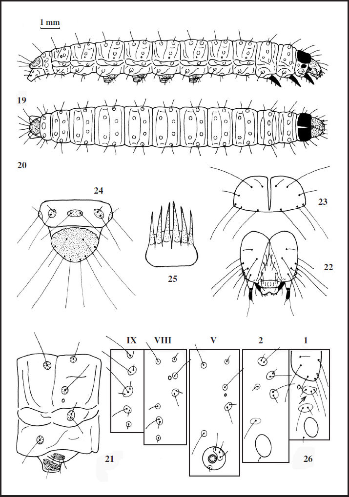 Quetotaxia: Para la denominación de las setas, se ha seguido a HINTON (1946), descubriendo que su distribución en ambas especies es prácticamente idéntica, solo hemos observado que las setas L1, L2 y L3 del protórax, que están insertadas dentro de la tabula, están en línea recta en indusiana y formando un triángulo en limoniana. En el mesotórax, el grupo SD1-SD2, está más separado de L2 en limoniana. En el noveno urito, se observa que el conjunto de todas las setas, forman un arco en indusiana, y más recto en limoniana. Por lo demás son muy parecidas, con ligeras variaciones en su ubicación. (figs 8 y 26).