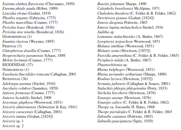 Of the Lepidoptera species inventoried in this study, three are included in the Brazilian Red List of threatened fauna (MMA, 2014): (1) Magnastigma julia Nicolay, 1977 (Lycaenidae) (endangered); (2) Strymon ohausi (Spitz, 1933) (Lycaenidae) (endangered); and (3) Rhetus belphegor (Westwood, 1851) (Riodinidae) (critically endangered). At least five species are endemic to the Cerrado biome: (1) Cogia cerradicola (Mielke, 1967) (Hesperiidae); (2) Parides bunichusdiodorus (Hopffer, 1865) (Papilionidae); (3) Nhambikuara cerradensis Freitas, Barbosa & Zacca, 2018 (Nymphalidae); (4) Yphthimoides cipoensis Freitas, 2004 (Nymphalidae); and (5) Sertania jaibensis (Callaghan & Soares, 2001) (Riodinidae).