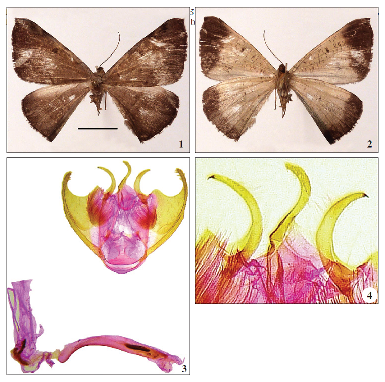 Descripción (Figs 1-2): La expansión alar del macho es de 40 mm. Cabeza, tórax y abdomen con predominio de la tonalidad marrón oscuro. Antenas simples o filiformes. Ambas alas con fondo alar marrón oscuro, más acentuado en la zona apical y submarginal, hasta el ángulo anal o tornus; rudimentarias líneas paralelas en la zona mediana; punto discal más oscuro en las alas anteriores y más reducido en las alas posteriores. Las alas anteriores con ápice puntiagudo; el termen de las alas es recto y la costa de las alas posteriores es más claro resaltando bastante con el fondo alar más oscuro. En el reverso de las alas se distingue el mismo diseño que en el anverso en las zonas en la zona apical y submarginal, hasta el ángulo anal o tornus, mientras que el resto del fondo alar es blanco grisáceo salpicado de pequeños trazos oscuros y en las trazo discal más marcado que en el anverso el cual es bastante más monótono.