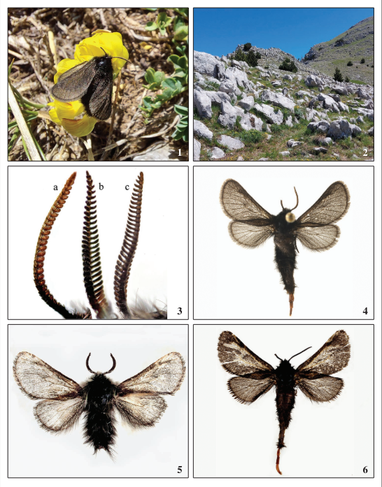 The female was found on the South slope of the Mount Pollino, on a dry rocky prairie (Figures 1- 2). We observed very scarce butterflies and small geometrids such as several Cleta filacearia (HerrichSchäffer, [1847]) and rare Lythria cruentaria (Hufnagel, 1767). At 13:30 a specimen supposedly belonging to the Psychidae family was observed flying frenetically on the ground, jumping from one flower to the next. Its correct identification as a specimen of Stygioides, very rare in Italy, was early recognized and here specifically identified as Stygioides italicaMazzei & Yakovlev, 2016.