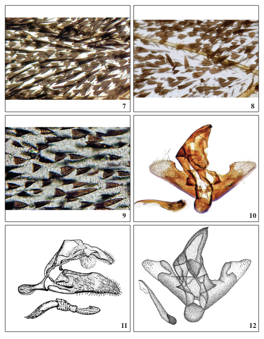 Lastly, in addition to the adult habitus of Stygioides italica (Figures 4-6), some important distinctive characters, such as the antennas (Figures 3a-c), the scales that cover the upper surface of the female forewings (Figures 7-9) and the male genitalia of nearest species (Figures 10-12), were shown.