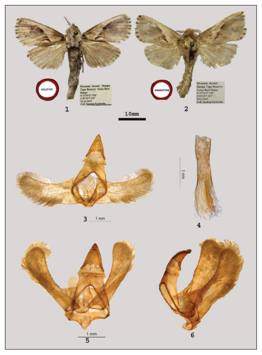 Collection of adult moths was done from the Mizoram (Dampa Tiger Reserve) by using vertical sheet light trap illuminated by 160W mercury vapor lamp. The collected specimens were processed as per standardized techniques in Lepidopterology. The collected specimens and slides of genitalia are deposited in the National Zoological Collections of Zoological Survey of India (NZCZI), Kolkata.