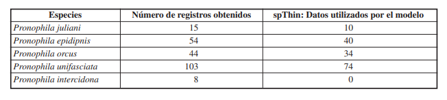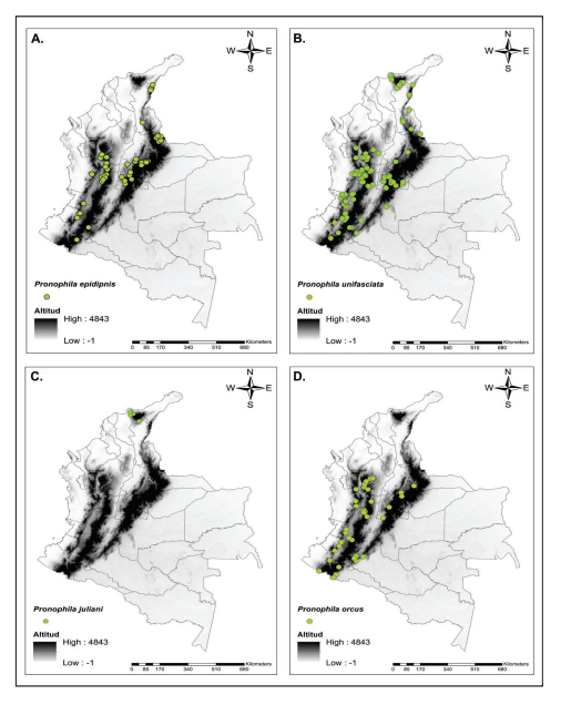 Los modelos de distribución potencial se proyectaron a partir de los datos de distribución geográfica recopilados para cada especie de Pronophila reportadas para Colombia ( Figura 2), los cuales se importaron a Microsoft Excel y se guardaron en formato “CSV”. Se uso el paquete spThin en R para realizar la reducción espacial de los registros de ocurrencia de las especies de Pronophila, para disminuir los problemas asociados con los sesgos de muestreo espacial, puesto que, la reducción elimina la menor cantidad de registros necesarios para disminuir sustancialmente los efectos del sesgo de muestreo y, al mismo tiempo, retiene la mayor cantidad de información útil ( Aiello-Lammens et al. 2015). Por tal razón, sólo se emplearon en el estudio cuatro de las cinco especies de Pronophila reportadas para Colombia ( P. unifasciata Lathy, 1906, P. juliani Adams & Bernard, 1977, P. epidipnis Thieme, 1906 y P. orcus (Latreille, [1813])), y no se consideró la especie P. intercidona Thieme, 1907 debido a la escasez de datos de presencia, lo cual no permitía realizar una buena proyección de la distribución potencial reciente y futura ( Tabla I).