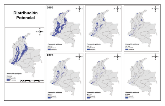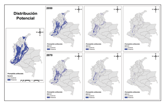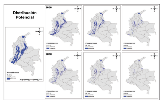 La predicción planteada en la presente investigación es que se espera que las especies del género Pronophila, exhiban una disminución en sus áreas de distribución potencial futura, observándose los efectos más severos bajo el escenario RCP 8.5 para ambos años 2050 y 2070, puesto que las emisiones y concentraciones de gases de efecto invernadero en este escenario aumentan exponencialmente con el tiempo ( Riahi et al. 2011; IPCC, 2013). En los resultados encontrados se evidenció una reducción de la distribución potencial en los diferentes escenarios de cambio climático tanto para el año 2050 y 2070 para las diferentes especies de Pronophila. Finalmente, el presente estudio permite contribuir al conocimiento de los patrones de distribución de este grupo de especies en los bosques Andinos en el país y el efecto del cambio climático antropogénico sobre estos patrones geográficos. Además, los resultados de este estudio pueden emplearse para desarrollar estrategias de conservación que mitiguen la disminución de la población y las extinciones locales predichas por el cambio climático antropogénico en lepidópteros asociados con ecosistemas montañosos del país.