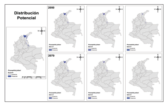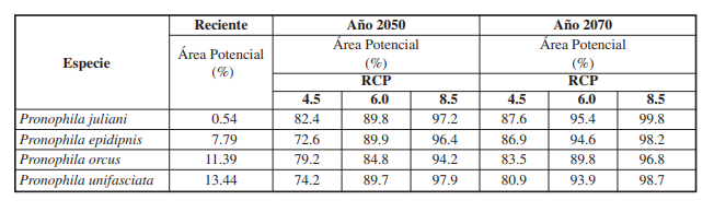 Los resultados muestran que las cuatro especies de Pronophila podrían experimentar una reducción sustancial en sus áreas de distribución potencial futura (2050-2070), puesto que, se aprecia una pérdida generalizada del área potencial de ocupación en relación con la distribución potencial reciente, siendo la especie P. juliani las más afectada ( Tabla V). A su vez, se evidenció que P. juliani presentó el mayor porcentaje de perdida de distribución potencial en todos los RCPs para los años 2050 y 2070 en comparación con las otras especies de Pronophila ( Tabla VI). Adicionalmente, se observa que para el RCP 8.5, tanto para el año 2050 y 2070, todas las especies de Pronophila tenderán a perder más del 92 % de la distribución potencial. Los resultados permiten inferir que, la distribución potencial de las especies de Pronophila empleadas se verán fuertemente afectadas por el cambio climático antropogénico en el año 2070, sin importar el escenario RCP ( Tabla VI). Por lo tanto, por medio de las proyecciones realizadas sobre la distribución potencial del género Pronophila para el año 2050 y 2070, se logra evidenciar el efecto negativo del cambio climático antropocéntrico sobre la distribución potencial de estas especies en el país.