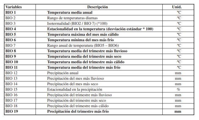 En la proyección de los modelos se emplearon las 19 variables bioclimáticas disponibles en WorldClim versión 2.1 ( Tabla II) ( Hijmans et al. 2005; www.worldclim.org), las cuales son el promedio de las precipitaciones y temperaturas para los años 1970 al 2000. Las capas con las variables bioclimáticas presentaron una resolución espacial de aproximadamente 1 km2 (30 segundos), con el propósito de tener datos con mejor resolución en la modelización (Varela et al. 2015; Gebrewahid et al. 2020). Posteriormente, se calculó el coeficiente de correlación de Pearson para examinar la correlación cruzada entre las 19 variables climáticas mediante el programa R versión 4.2.3 ( R Development Core Team, 2023), para evitar la multicolinealidad que puedan resultar en un sobreajuste del modelo ( Wang et al. 2018; Gebrewahid et al. 2020; Du et al. 2021). Por lo tanto, sólo se emplearon variables con correlaciones bajas (|r| < 0.8) para disminuir el fenómeno de sobreajuste y mejorar la precisión de las pruebas ( Elith et al. 2010; Gebrewahid et al. 2020). Acorde a los análisis de correlación entre las 19 variables, se seleccionaron solo nueve variables bioclimáticas para los análisis: BIO1, BIO4, BIO5, BIO6, BIO8, BIO9, BIO10, BIO11 y BIO19 ( Tabla II).