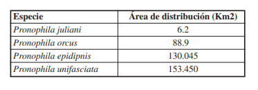 Basados en los resultados obtenidos, otras de las variables con importante incidencia en las especies estudiadas fueron la temperatura máxima del mes más cálido (BIO5), temperatura promedio del trimestre más seco (BIO9) y temperatura promedio del trimestre más cálido (BIO10). Con base en esta información, se puede inferir que estas variables están relacionadas con la escasez de agua en época de calor, tiempo en el cual las especies del género Pronophila posiblemente se encuentren en etapa de reproducción, como sucede con Pedalidoes cocytia (C. Felder & R. Felder, [1867]) y Lymanopoda schmidti Adams, [1986], especies que habitan en alta montaña en Colombia ( Moreno & Ortiz-Pérez, 2012). A su vez, el agua es esencial para la reproducción de los Lepidoptera, ello podría afectar la posibilidad de intercambio de material genético entre los individuos que componen el género, puesto que la no disponibilidad del recurso hídrico puede ocasionar una reducción significativa de la fecundidad y fertilidad ( Torres-Vila et al. 1996). Por otro lado, la variable bioclimática precipitación del trimestre más frío (BIO19), tuvo únicamente influencia en la especie P. juliani, porque presenta un rango de distribución más estrecho que el resto de las especies, esto es porque hay pocos datos de presencia de la especie, por lo cual el software toma la variable, como un referente bioclimático único y se considera como un posible sesgo del modelo (Varela et al. 2014).
