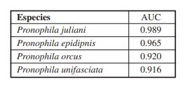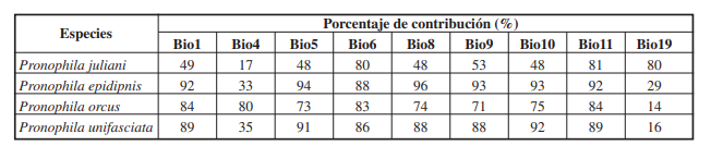 Las variables bioclimáticas empleadas en los modelos de distribución potencial reciente y futuro (2050-2070) para las cuatro especies de Pronophila, en su mayoría estaban asociadas a la temperatura. Adicionalmente, se evidencia que para P. juliani, las variables climáticas que influyeron en el modelo fueron BIO6, BIO11 y BIO19, siendo esta última, la única variable asociada a la precipitación. Para las especies P. epidipnis y P. unifasciata, las variables con mayor contribución fueron BIO1, BIO5, BIO6, BIO8, BIO9, BIO10, y BIO11, y para P. orcus fueron BIO1, BIO4, BIO6, y BIO11 ( Tabla VII).