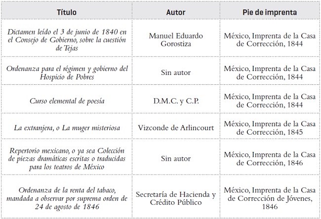 Por los pocos títulos que he podido ubicar, ya sea físicamente o por sus referencias en otras publicaciones, pareciera que en ese primer momento el pequeño taller tipográfico de la Casa de Corrección tan solo produjo un número bastante reducido de impresos (Tabla 1). En primer lugar hay que mencionar las obras de enseñanza elemental que fueron empleadas para la instrucción de los corrigendos. Además de ellas, se imprimieron varias ordenanzas, emitidas por el Ayuntamiento, así como otros documentos de carácter diverso, publicados a instancias del propio Gorostiza, quien por entonces se conducía camaleónicamente, combinando su labor filantrópica con su actividad política y su pasión por el teatro, además de desempeñarse como encargado de la administración de la renta del tabaco.