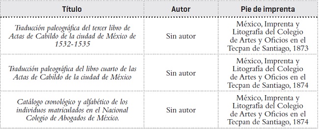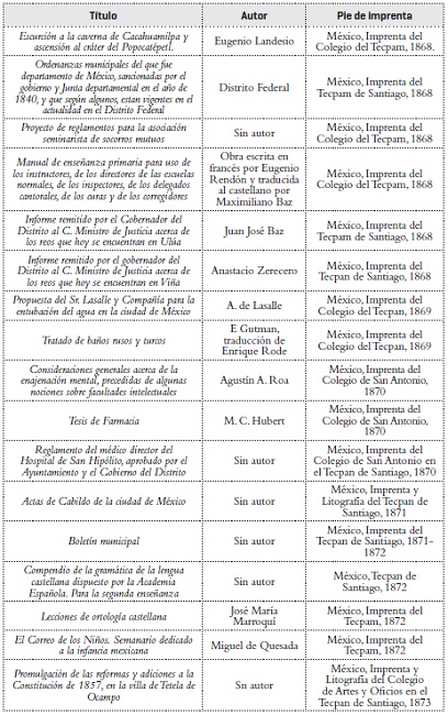 Esta situación cambió radicalmente con la Restauración de la República y el establecimiento de la Beneficencia Pública. Entonces, el Colegio se hizo de nueva maquinaria de impresión (tomada del Hospicio de Pobres23) y se le asignaron varios trabajos de importancia, como una edición de la Constitución de 1857 (Tabla 2).24