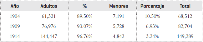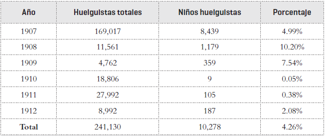 El promedio de intervención infantil en las huelgas entre 1907 y 1912 (4.26%) es congruente con su participación en la fuerza de trabajo industrial, que en 1904 era de 10.50%, en 1909, 6.93% (cuando los niños huelguistas fueron el 7.54%) y en 1914, 3.24% (Tabla 2). A través de las tablas puede apreciarse que la participación infantil en las huelgas fue similar a la de los adultos, quienes han sido tomados como modelo del trabajador consciente y organizado. Así pues, no es correcto afirmar que “la mano de obra infantil rara vez manifestaba su descontento”,45 puesto que los niños participaron de numerosos conflictos laborales. Si bien las estadísticas no permiten discernir si los niños intervinieron acompañando movimientos impulsados por los adultos, si se movilizaron de conjunto por demandas compartidas (como el aumento salarial o la disminución de las horas de trabajo), o si lo hicieron de forma autónoma y con demandas propias, sí evidencian que la fuerza de trabajo infantil participaba en los conflictos huelguísticos.