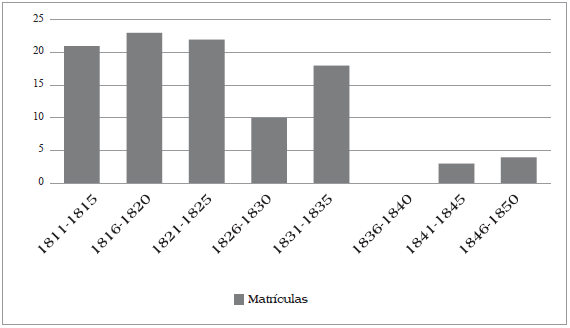 Ao observarmos a flutuação das entradas de matrículas de expostos por quinquênios, percebemos que sua maior recorrência se dá no período de 1816 a 1825. Após esse período há uma queda nas entradas, aumentando novamente no período de 1831 a 1835. Nos períodos posteriores (1836-1850) evidenciou-se o declínio da assistência aos expostos pela Câmara de Rio Pardo, pois poucas crianças foram matriculadas (Figura 1).