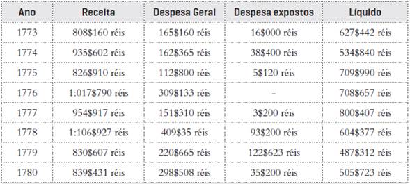 Numa tentativa de estimar o montante dos valores gastos com o pagamento de despesas relativas aos expostos, valemo-nos de um quadro das despesas anuais camarárias para o período de 1773 a 1780, elaborado por Adriano Comissoli, autor já referido. Com isso, pretende-se uma aproximação às despesas referentes aos expostos, a partir do montante de pagamentos arrolados como despesa geral, expressos nos termos de vereança, conforme a Tabela 1.