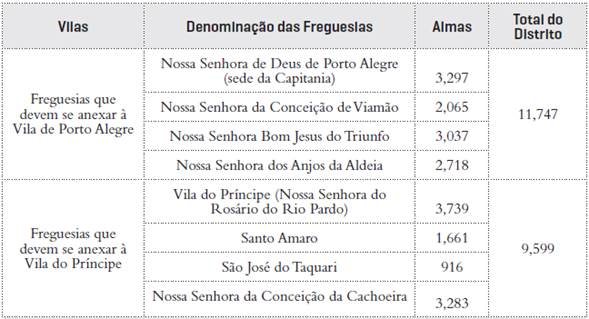 Como foi esclarecido anteriormente, até 1809, quando a freguesia de Porto Alegre foi oficialmente elevada ao estatuto de Vila, era a Câmara de Rio Grande que se encontrava estabelecida naquela freguesia. A divisão do território sulino em quatro Vilas foi uma demanda expedida por carta do governador do Rio Grande de São Pedro, Paulo José da Silva Gama, ao príncipe regente, em dezembro de 1803.36 Nessa carta, o governador envia em anexo os mapas de população como prova do tamanho populacional da Capitania e a proposta de sua divisão em quatro municípios para uma administração mais eficaz.