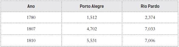 A primeira questão diz respeito aos contingentes populacionais: a Vila de Rio Pardo (9.599), composta pelas quatro freguesias, possuía uma população com número inferior em relação à Vila de Porto Alegre (11.747).39 Entretanto, ao tratarmos das sedes das Câmaras, Rio Pardo possuía um contingente populacional de 3.793 almas, enquanto Porto Alegre, 3.297. Ao observarmos alguns dos Mapas de Populações disponíveis para a Capitania sulina, podemos ver que a Freguesia de Rio Pardo sempre possuiu uma população mais numerosa em relação a Porto Alegre. Comparamos aqui os contingentes populacionais descriminados, ou seja, livres, indígenas, forros e escravos (Tabela 3).
