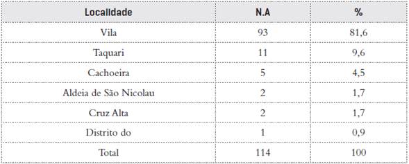 No que se refere às crianças expostas cujos criadores deram entrada direta na Câmara de Rio Pardo, a predominância (81,6%) eram da sede da Vila, ou melhor, da Freguesia de Nossa Senhora do Rosário de Rio Pardo. Como podemos perceber, poucos foram os receptores de expostos que se deslocaram das freguesias vizinhas, pertencentes à jurisdição administrativa de Rio Pardo, para matricularem os expostos na intenção de receberem salários para sua criação, o que pode nos indicar que os índices de exposição nessas freguesias eram baixos e que essas crianças eram amparadas gratuitamente nessas localidades, ou ainda que, assim como Porto Alegre, procuraram expor na sede da Vila - no caso em questão, Rio Pardo. Mas, para maior certeza dessa afirmativa, são necessárias pesquisas futuras se utilizando dos registros de batismos dessas freguesias (Tabela 4).