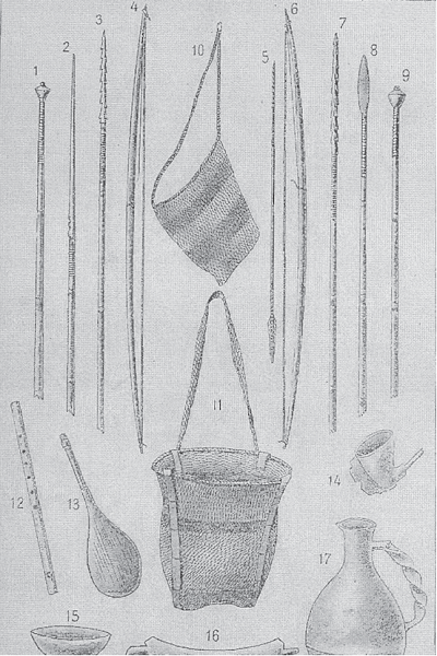 El texto sobre los guayakis hace, de igual manera, referencia a sus objetos característicos, fundamentalmente, arcos y flechas. Menciona también sus “curiosas” urnas de cera, las cuerdas fabricadas con cabello humano, las hachas de piedra, los collares de dientes de mono y los grandes cestos para transportar a los niños.43 Según sus propias palabras, se trata de elementos marcados por su extrema simplicidad, poca variedad y falta absoluta de búsqueda artística. A pesar de todo, Machon no se resiste a hacer acopio de estos objetos que, en su opinión, certifican el primitivismo y la rareza de estos indígenas.