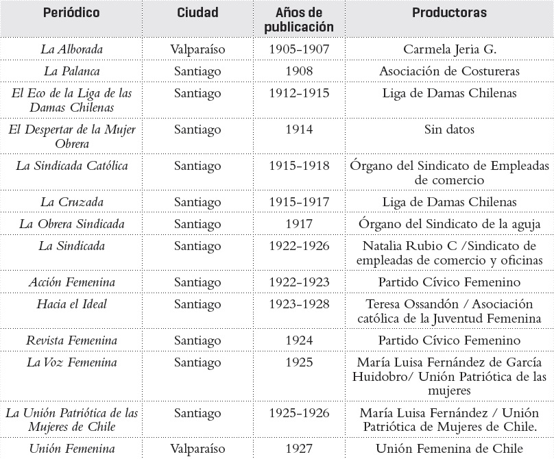 El objetivo es brindar un panorama de la prensa política hecha por mujeres entre 1900 y 1929 que incluye una tipología de las publicaciones. Para ello se consideraron periódicos y revistas producidos por organizaciones apoyadas en diversos orígenes sociales e ideológicos: publicaciones de obreras, de clase media y elite; feministas, conservadoras, socialistas y católicas. Si bien existen trabajos previos que han realizado un panorama de estas producciones, este ha sido incompleto.5 Aquí presentamos catorce órganos de difusión que forman parte del segundo periodo de la historia de la prensa de mujeres en Chile, el cual ha sido denominado “la explosión de las voces” de acuerdo con la periodización definida por Montero.6