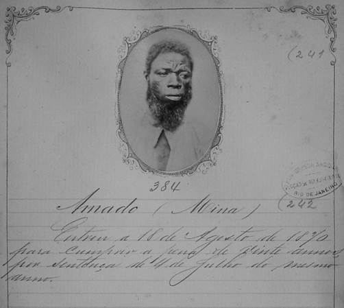 Amado Mina tentou matar o seu senhor, que morava na rua Nova do Livramento, na noite de 2 de agosto de 1869. Preso, disse no julgamento que “devendo dois dias de jornal, instava seu senhor por essa quantia declarando que havia de vendê-lo; e então procurou fugir pela janela”.36 Foi condenado 20 anos de galés, a pena máxima prevista pelo artigo 193 do código criminal.37 Amado Mina talvez beirasse os 60 anos. Era um escravo de ganho. E devia ser um Mina maometano, pois seu nome verdadeiro provavelmente era Ahmad e não Amado como lhe chamavam os brasileiros.38 (Figura 1).