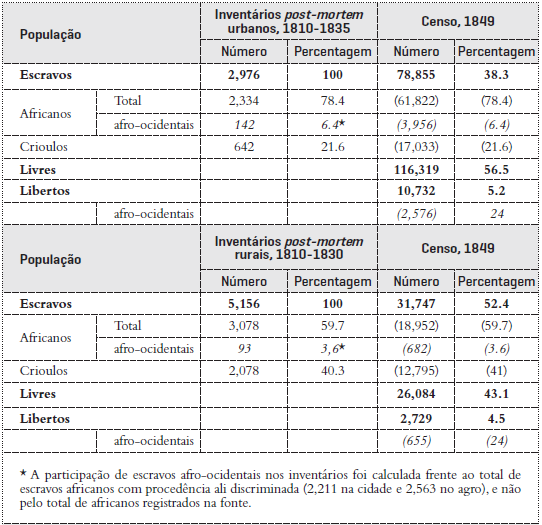 Os mesmos procedimentos metodológicos aplicados ao censo de 1849 permitem estimar a presença dos afro-ocidentais na cidade e dos maometanos entre eles. A amostra de inventários agora é uma série de documentos, abertos entre 1810 e 1835, e um conjunto de cartas de alforria registradas em cartórios do Rio de Janeiro, entre 1840 e 1849.