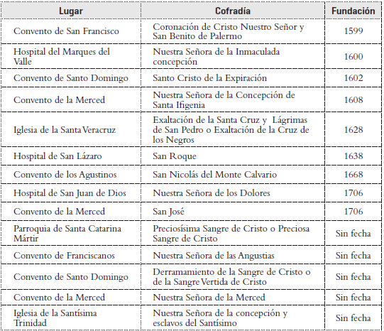 Las primeras cofradías de negros y mulatos en Ciudad de México se instituyeron en el siglo XVI.14 La primera fue la de San Nicolás Tolentino, establecida en 1560 en la parroquia de la Veracruz; años más tarde, en 1599 se constituyó la de la Coronación de Cristo y San Benito de Palermo en la iglesia de Santa María la Redonda, que se trasladaría después al convento de San Francisco.15 Como se ha dicho fue en el siglo XVII cuando se dio su esplendor, tal como se puede apreciar en la Tabla 1 donde se muestra la importancia que habían adquirido y que tuvieron las asociaciones piadosas de africanos y sus descendientes a lo largo del siglo XVII.