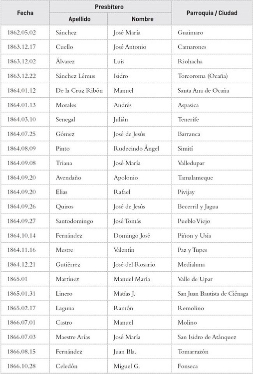 En consecuencia, buena parte de los presbíteros, incluidos la mayoría de los presentes en la Tabla 1, siguieron un itinerario semejante. Aceptaron los decretos y leyes referenciadas, salvaron su responsabilidad civil, recibieron informe de las sentencias eclesiales, presentaron la contrición oportuna y, con el beneplácito del vicario apostólico, recuperaron sus plazas y se les levantó la excomunión aplicada. De manera que en la actuación de los clérigos prevaleció su rol de eclesiásticos, movidos por la fe o por deseos plenamente mundanos. Así ocurrió con el vicario de San Juan Bautista de la Ciénaga, Matías J. Linero: su caso plasma nítidamente la inclinación de los clérigos por el regreso o la permanencia en el ministerio católico.
