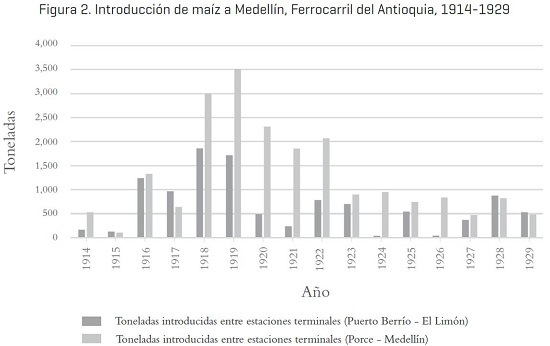 Por ahora, hay una evidencia más sólida que expone un gran flujo de producción y comercio de alimentos: las estadísticas de los ferrocarriles que conectaban a Medellín con el sur (Ferrocarril de Amagá) y con el Magdalena Medio, la región Caribe y el centro del país (Ferrocarril de Antioquia). El examen de la carga del tráfico ferroviario antioqueño constituye un recurso que permite identificar el origen, destino y cantidades de cereal transportado por las vías férreas. El análisis de la carga ferroviaria también demuestra los procesos económicos que se presentaron en los espacios atravesados y conectados por las líneas del ferrocarril, por ejemplo, la formación de un mercado interno en las primeras décadas del siglo XX.33 La carga agrícola del sistema ferroviario de Antioquia estaba compuesta por productos como el maíz, el cual durante algunos años ocupó el primer lugar en cuanto a peso o tonelaje; y en otros fue el café y el trigo.34 El resto de la carga agrícola incluía arroz, algodón, cacao, frijoles, papas, pastos y semillas, tabaco, cebada, frutas, legumbres y harinas.