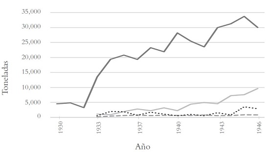 Entre 1930 y 1946 se acentuó la necesidad de introducir mayor cantidad de maíz en el marco de una creciente conectividad de Antioquia con el resto del país. Además de la vía férrea hacia Puerto Berrío que ya operaba de forma continua desde 1929, el Ferrocarril de Amagá que comunicaba a Medellín con el sur había logrado en 1933 terminar la estación Alejandro López, en lo que es hoy el municipio de La Pintada -una red vial de aproximadamente 144 kilómetros-, en los límites con el departamento de Caldas.39 Desde y hacia ese lugar también ocurrió un comercio que, motivado por el carbón y el café de esa zona, propició el flujo de productos agrícolas e industriales en sus diversas manifestaciones. En menos de dos décadas por las vías de los ferrocarriles de Antioquia y de Amagá la introducción de maíz a Medellín se multiplicó casi ocho veces: pasó de 4,530.7 a casi 40,000 toneladas anuales (Figura 3). Una explicación simple es que esto obedeció al crecimiento poblacional y a la ampliación de la demanda hacia otros sectores que requerían proveerse de este producto, verbigracia la ganadería vacuna, porcina y avícola.40