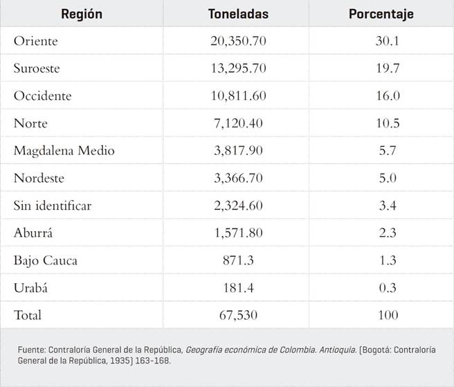 Esto indica que la producción de maíz en la cordillera Occidental en Antioquia era soporte para atender el mercado de Medellín, ubicada en un valle interandino en la cordillera Central de Colombia.27 En la década de 1930 este cereal era cultivado en 97 de los 98 municipios que integraban Antioquia y el total de la producción ascendía a la cantidad de 613,907 cargas de 110 kilogramos cada una, o sea, 67,530 toneladas. De este modo, la producción del maíz según aproximaciones era casi el doble de la de café, que para 1933 fue de 38,282 toneladas.28 Sin embargo, esta cantidad producida era insuficiente para atender la demanda del producto como lo evidencian cifras expuestas más adelante. La tendencia para esos años era que desde el oriente, el suroeste y occidente llegaban dos terceras partes del maíz para el mercado de la ciudad (Tabla 1).
