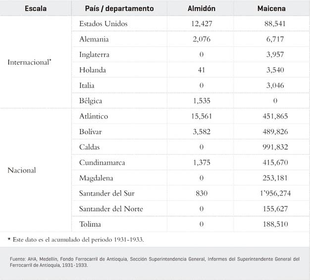 Un dato más preciso sobre la procedencia de maíz en Medellín lo ofrecen los informes del superintendente del Ferrocarril de Antioquia que son cambiantes cada año, lo que impide hacer una sistematización de diversos procesos. A pesar de ello, hay datos entre 1931 y 1933 que permiten considerar otra dinámica de la procedencia del grano en la ciudad. Desde diversas regiones de Colombia se introducía maíz a Medellín tanto desde el Caribe, Caldas y los Santanderes llegaba producción de este cereal. El maíz arribaba desde diferentes pisos térmicos y de muchas variedades para diversos requerimientos productivos en la ciudad. Algunas fuentes de empresarios rurales antioqueños ofrecen datos sobre la red de producción y comercio constituida para introducir este cereal desde tierras caribeñas, en especial de los valles de lo ríos Sinú y San Jorge hacia Medellín. Desde la hacienda Cuba, situada en el municipio de Montelíbano (en el actual departamento de Córdoba), en los años de 1930 se despachaba el grano producido allí por el puerto de Magangué, mediante vapores que transitaban por el río Magdalena hasta Puerto Berrío y luego por vía férrea hasta Medellín.41 Este dato revela la conexión del transporte férreo y fluvial en la integración regional de mercados agrícolas, como lo expone el caso del maíz.
