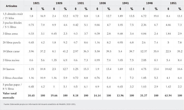 Una señal más evidente del lugar del maíz en esta embrionaria cultura urbana era la oferta del producto en el mercado de la ciudad, lo cual ofrece una pista de la transición de una sociedad productora a una consumidora. En el Indicador López, el cual medía la variación de precios de la canasta alimenticia antioqueña conformada por nueve artículos,65 el maíz era considerado como alimento básico para una familia de clase media típica, compuesta para aquel periodo por 10 personas (Tabla 3).