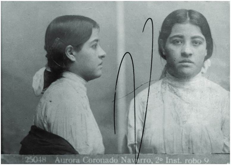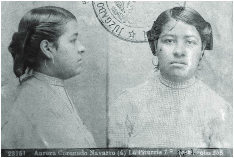 La primera vez que el autor de este trabajo encontró información sobre Aurora Coronado fue en la sala de consultas del Archivo General de la Nación de México. Se le quedó grabado su apodo: la Piturris. Se trataba de un voluminoso expediente iniciado el 14 de febrero de 1909 contra Cosme Ojeda, Francisco Pineda, Soledad Villaverde, María Luz Espíndola y Aurora, por robo.1 Meses más tarde se le halló de nuevo, procesada esta vez con Antonio Somohano, Armando Bustínzar y Ramón Díaz por el mismo delito, en febrero de 1908.2 En ambos expedientes, Aurora fue pesquisada como cómplice de ladrones.